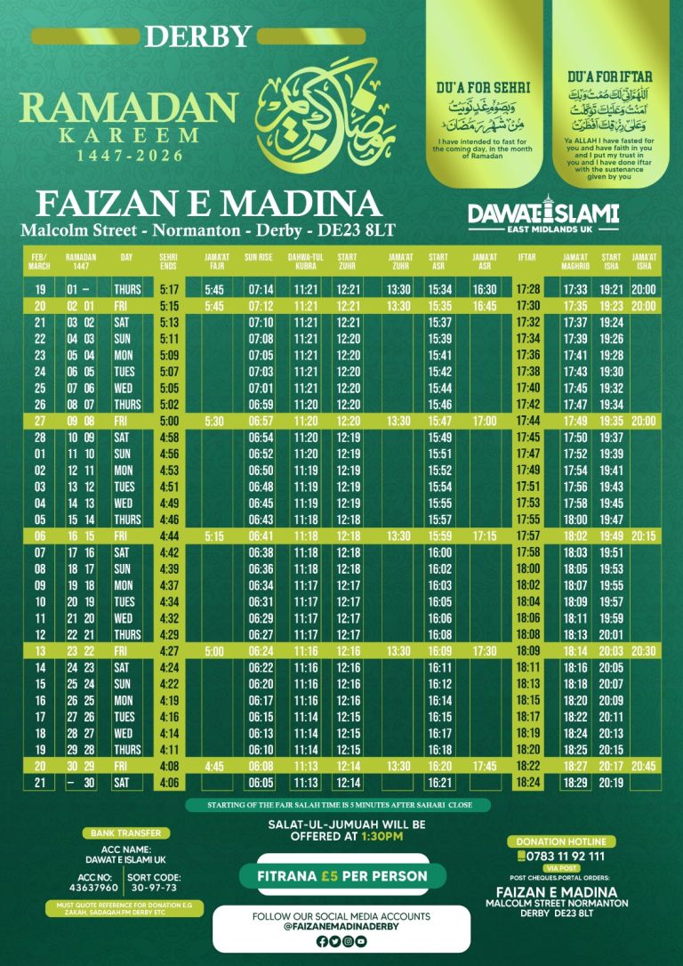 The Monthly prayer times for Faizan-E -Madinah Derby